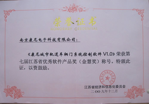 201007康尼城市軌道車輛門系統(tǒng)控制軟 件V1.0榮獲第七屆江蘇省優(yōu)秀軟件產(chǎn)品獎(jiǎng)(金慧獎(jiǎng))稱號(hào)證書